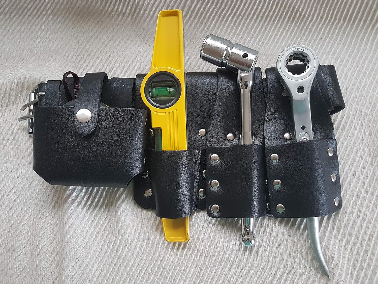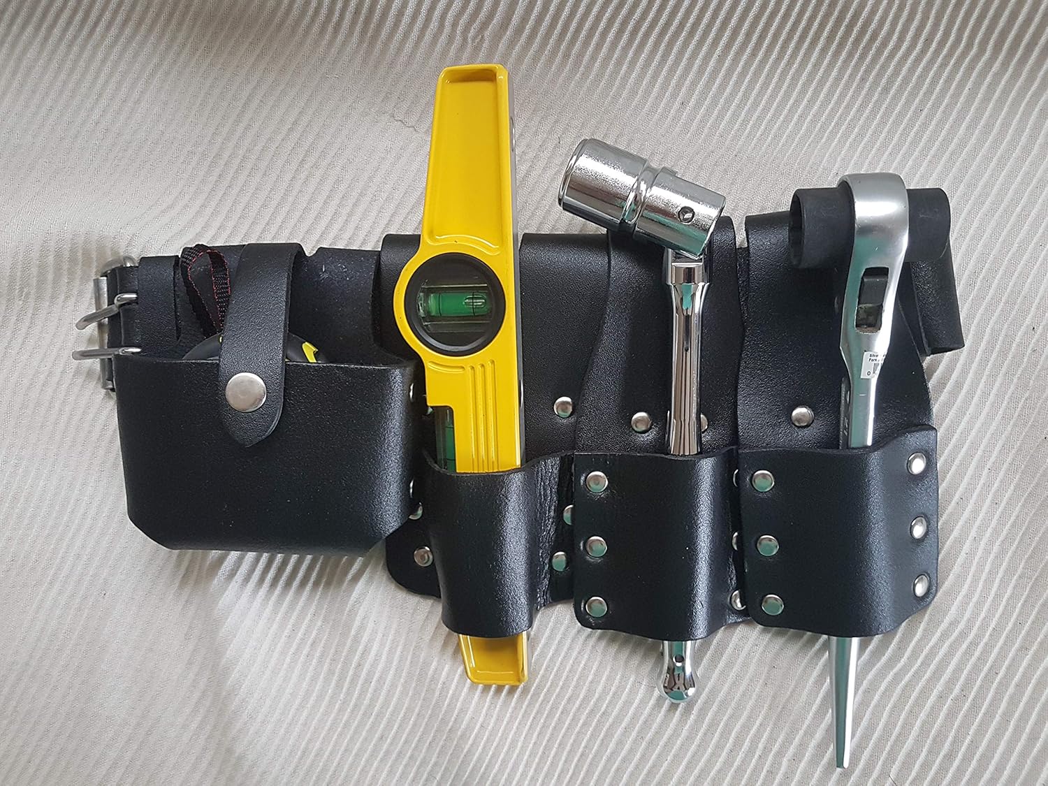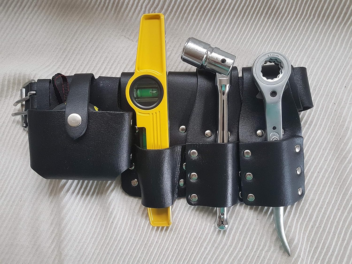Unmatched Durability and Design Crafted from strong, genuine leather, this belt is designed to endure the daily rigors of construction and scaffolding environments. The Large Size Leather Belt features a Tough Double Stud Press closure, ensuring a secure and reliable hold throughout your workday. The classic black finish maintains a professional appearance while offering superior longevity.